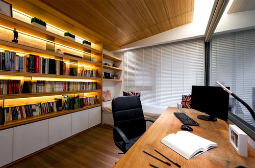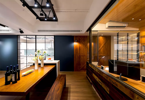 室內空間的串聯性,利用簡單的量體做出客廳與餐廳的區隔。書房隔間上使用玻璃與舊木料讓整個空間更為延伸,書房的實木斜天花延伸至書柜結合而成,具一致性,也讓書房與廳區天花做區隔,而窗邊的臥榻是屋主放鬆休憩的小角落。
