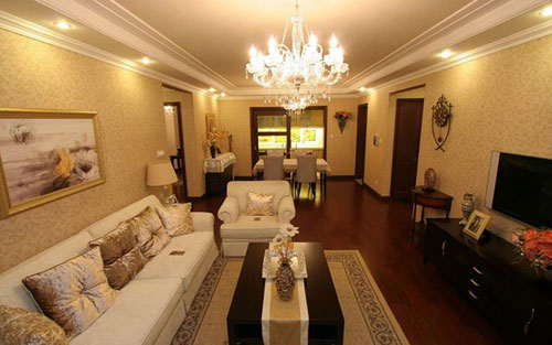 光線從天花板折射出來,既不刺眼,而日光燈所發(fā)出的光線最接近太陽光,對于采光不足的客廳而言最為適合,客廳內使用凹位造型吊頂,可以緩解天面形成的壓抑感。