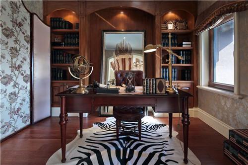 看到這款美式書房大家有何感想呢?它穩重而不沉悶,嵌入式的實木儲物柜成為一面不錯的背景墻,凹凸有致的造型設計讓書房更具空間層次感,斑馬紋理的地毯具有調節空間氣氛的效果,精美的花紋壁紙同樣具有柔化凝重氣氛的效果。