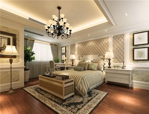 寬敞的臥室選擇用實木地板來裝點地面,給人舒適的觸感,淺灰色的地毯搭配穩重色彩的床品恰到好處,做工精湛的美式儲物柜依墻而設,舒時尚的吊燈彌補著上層空間的單調感。