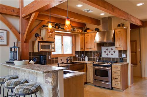 這款美式別墅廚房以實木為主,打造出一幅回歸大自然的生活畫面,不同尋常的空間布局讓廚房風格杯具一個,最具特色的要數那假房梁與立柱,為空間帶來了別樣的設計元素。