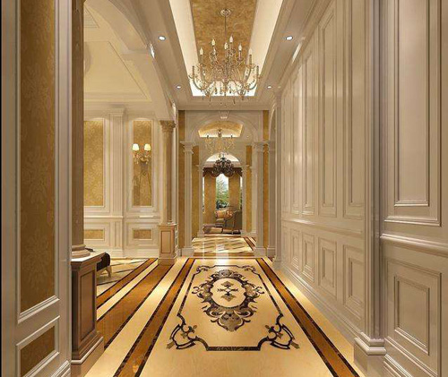 室內過道的地面設計建議使用耐磨易清潔的材料,地磚的花紋或者木地板的花紋最好橫向排布。地面的顏色可比頂面稍深,也可以區別于相鄰空間,但是也不宜太深。