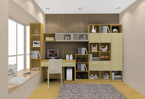 書房整體采用一體柜樣式,書桌就是書架和收納,方便使用的同時還節省空間。靠窗的位置讓給了飄窗,所以飄窗就有了很好的光線和很不錯的視野。柜子下方也同樣是收納,開放式設計有便于拿取。