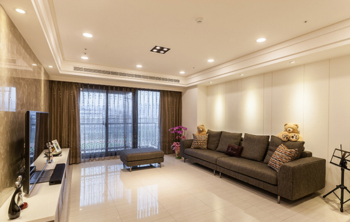 客廳空間大片落地窗,讓屋內(nèi)更加明亮,可直接穿透至餐廳空間,客廳墻面一貫純白作風(fēng),運(yùn)用線(xiàn)條加以展現(xiàn)空間細(xì)致度,電視墻以晶透灰水波紋大理石一展主人的氣派。客廳尾端空間設(shè)置大容量收納柜,可放置物品又可展示主人的收藏,在展示燈之下,更顯主人藝術(shù)氣息,同時(shí)也可兼做休憩區(qū),放置桌椅鋼琴等。