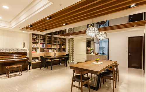 餐廳空間墻面承接電視墻的大理石,延續(xù)氣派感,天花板上方的大橫梁,運(yùn)用灰鏡加木紋格柵設(shè)計(jì),橫向的溝縫帶動(dòng)視覺(jué)上的延展,巧妙的使梁成為造型的一部分,設(shè)計(jì)師擴(kuò)大感的設(shè)計(jì),使空間更具有獨(dú)特魅力,吸睛度百分百。