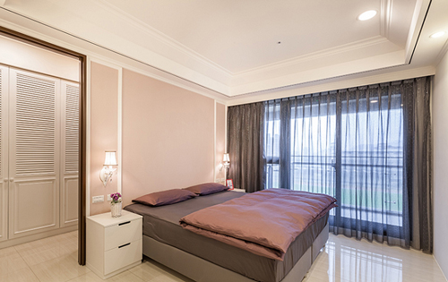 主臥空間依然保留古典韻味,以粉色系為主軸,搭配白色古典線(xiàn)板,展現(xiàn)柔美之情,更衣室使用帶有一點(diǎn)美式風(fēng)格的百葉衣柜,呈現(xiàn)干凈、舒適的空間,溫馨的色系混搭出雅致的空間表情。