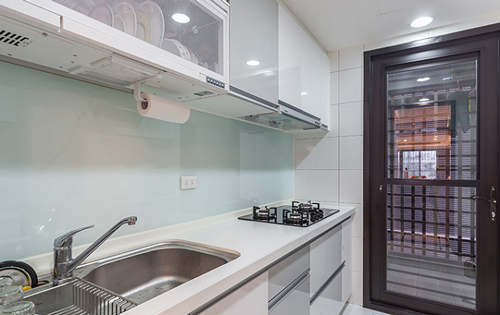 廚房入口處設(shè)置一小吧臺(tái),兼做餐廳與廚房的分野,同時(shí)也可當(dāng)作備餐桌使用,非常貼心,而廚房入口吧臺(tái)左側(cè),則利用灰鏡削弱冰箱柱體的存在感,提升整體時(shí)尚度。