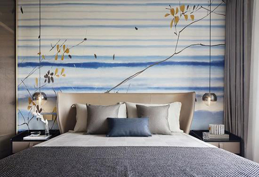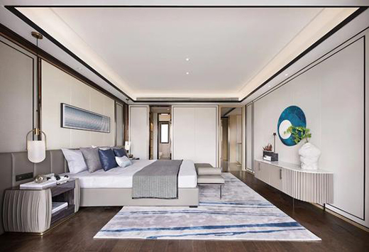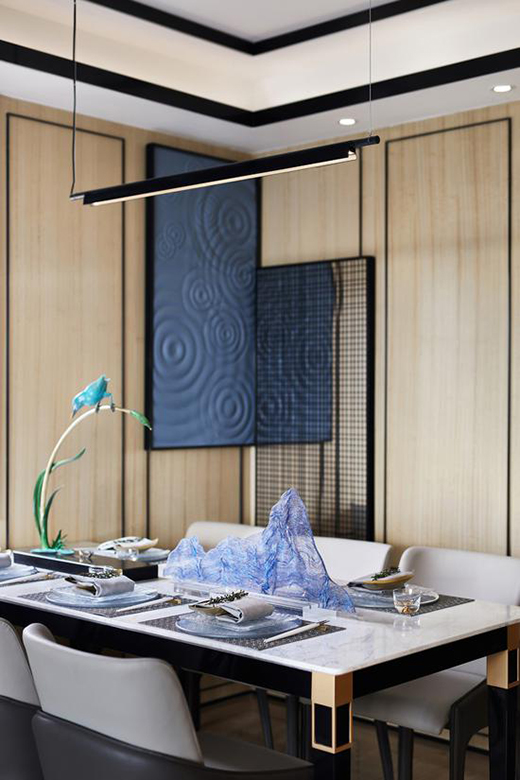 設(shè)計(jì)師賦予空間素凈簡雅的整體格調(diào),以凝練的筆法抒寫空間意蘊(yùn),將藍(lán)與白的設(shè)色抽象化,寫意湖天一色的自然勝景,又添畫幾筆干枝與樹葉,呼應(yīng)滿室清秀的藝術(shù)氣息。