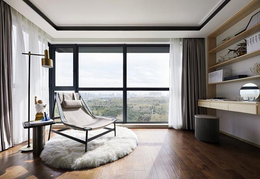 在兩面大落地窗前,簡潔書架、皮質(zhì)躺椅、毛絨地毯搭配極佳的觀景視野,推窗見蔥郁樹林,呼吸間是沁人鮮氧,得一隅休閑自在。