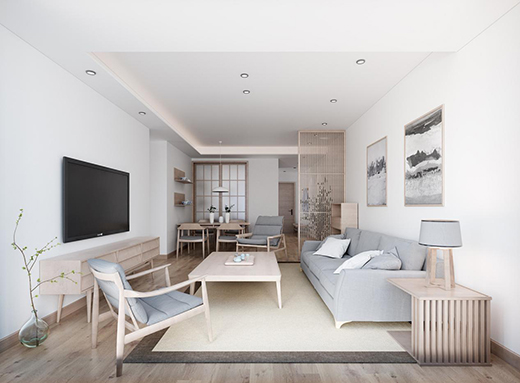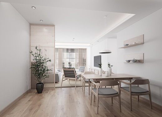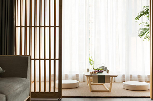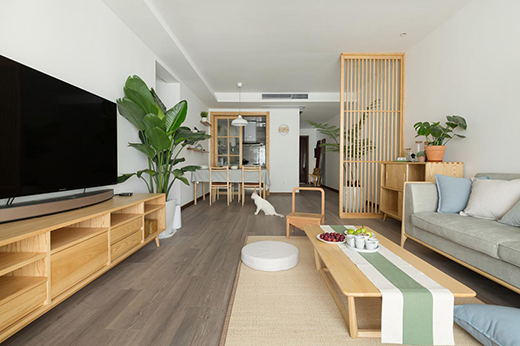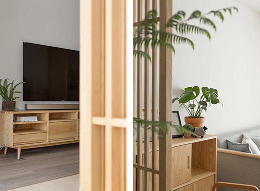 入戶處設置木質隔斷,形成一種隔而不斷的效果。客廳與陽臺之間設置木質推拉門,以區分不同的功能區。