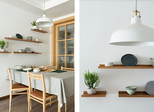 餐廳設置在廚房外,是一個十分精致、放松的功能空間。整體原木色的氛圍,讓人完全舒緩下來。隔板架用來收納餐廳小物很方便,不過陳列美觀還是很考驗審美的。