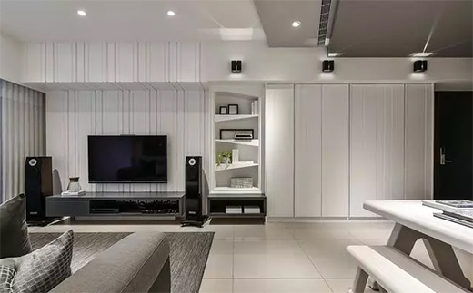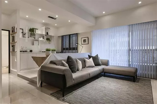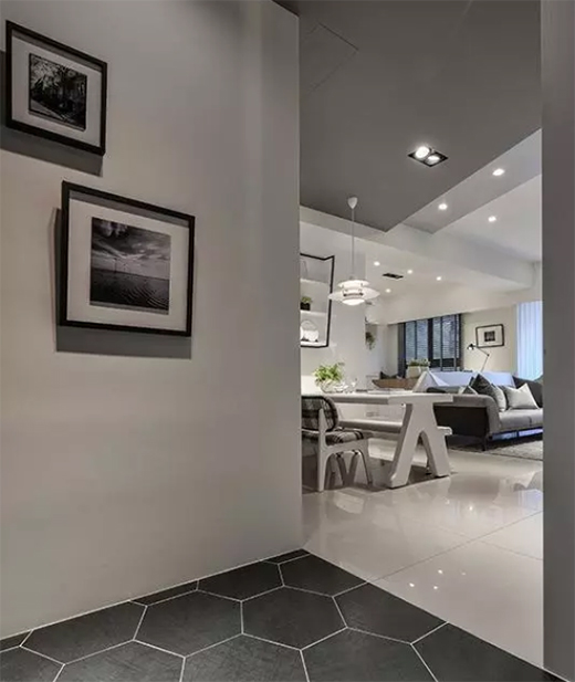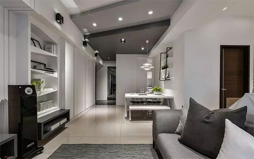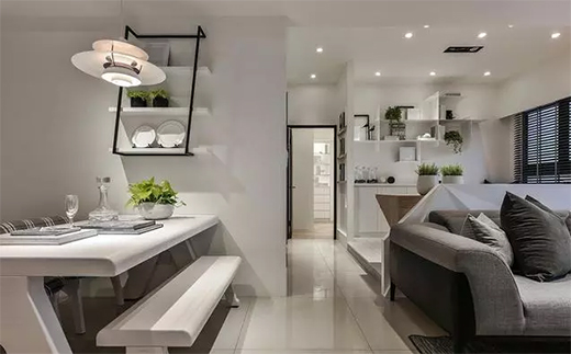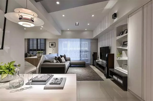 這個簡約風裝修的大兩居,在色彩布局上基本是以白色加深灰色外帶一點黑色調的裝飾,所以整體效果顯得特別干凈,優雅~對于愛干凈的人士來說,這樣的家想必是非常適合的