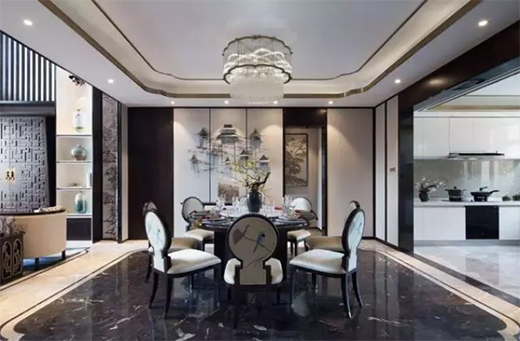 在簡潔硬朗直線條的新中式餐廳中沒有傳統中式家具的厚重感,以輕盈的步調和纖細溫實的實木餐桌椅打造出獨有的時尚元素,精致的餐具、素雅的青花瓷瓶等都延續著中國獨有的文化韻味,在精致水晶吊燈的觀影中愈加顯得婉約。