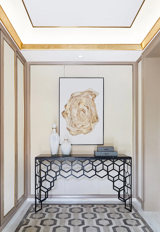 在玄關,圍繞主題展開的蜂巢造型端景臺,通過幾何變換延伸出輕盈別致的藝術性。裝飾畫似金色玫瑰優雅綻放,又仿若花蜜清瑩欲滴,恰到好處點綴了空間的視覺中心,勾勒出彬彬有禮的迎迓場景。