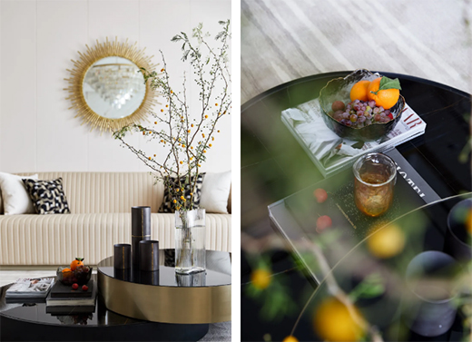 金屬鏤空隔斷增加了視覺上的層次,和質地考究的黑金碗蓮擺件一起讓家的精致氣息脫穎而出。