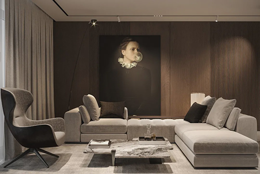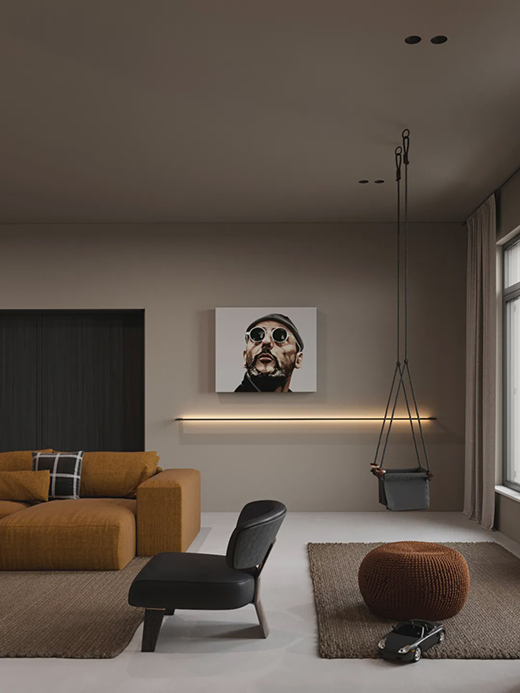 客廳采用無主燈照明,墻壁嵌入燈帶進行采光,燈光柔和而朦朧,是休憩的好去處。