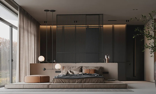 臥室的落地窗顯得室內空間開闊,兩盞球形吊燈精致美觀,和后面的燈帶一起烘托氛圍。