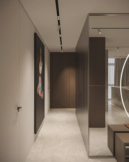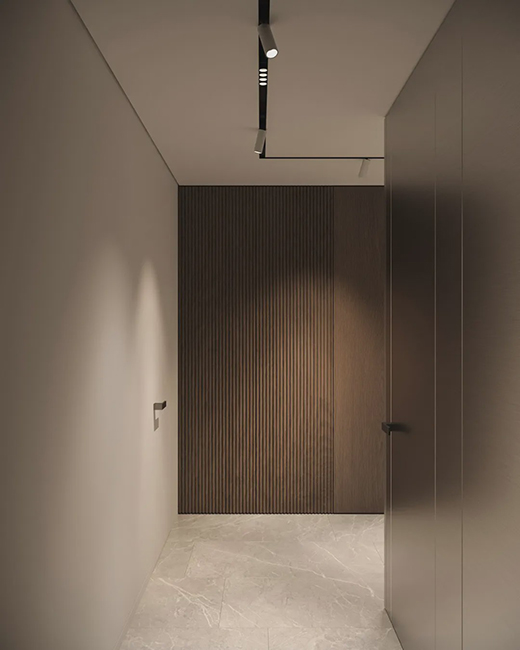 過道的地面和墻面分別由大理石和木材打造,在燈光的渲染下顯得頗有質感。
