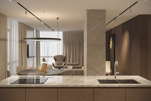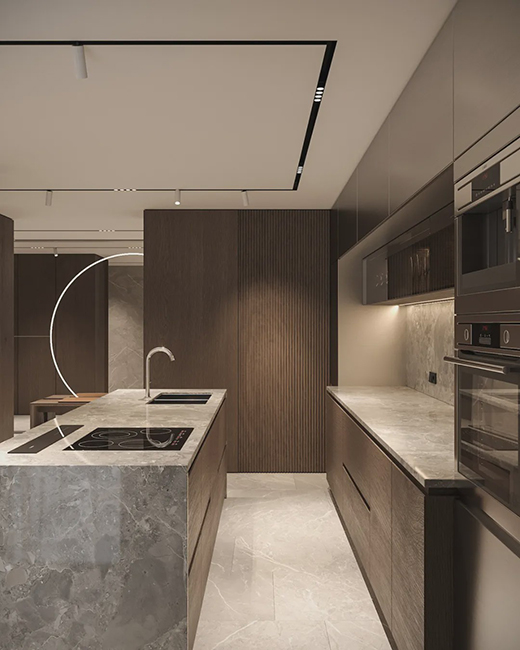 廚房照明采用筒燈加燈帶焦點燈輔助的形式,精致溫馨;大理石臺面紋理細膩,低調奢華。