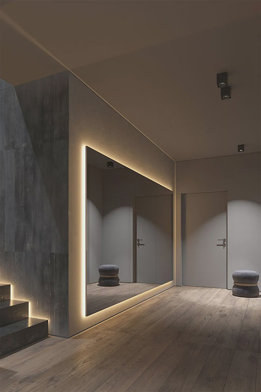 來自法國的這套以無主燈設計為主的公寓空間整個都彌漫著朦朧的氣質。輪廓光、焦點光和環境光是營造這個空間氛圍感的重要因素。