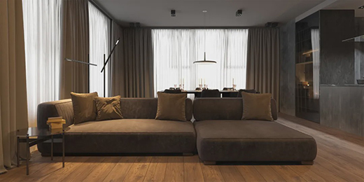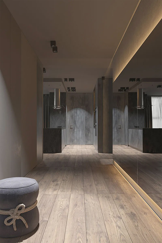 與大多數人向往的明亮干凈、格局方正的家不同,這個以灰木黑為主題,并添加燈光和網格,創造出充滿剛性氣質的住宅,可謂室內設計里的驚鴻一瞥。