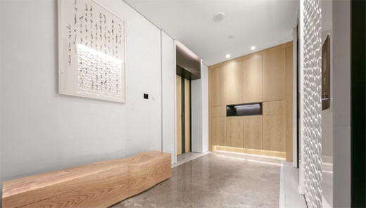 以白色墻面為主,融入原木質玄關柜以及卡座,簡約中透露著自然的生命張力;曲線波紋的墻面設計,猶如此起彼伏的水波,給空間提供韻律感。