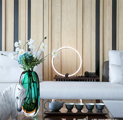 家具的設計上以深色木質元素和白色布藝相互搭配,營造莊重大氣古樸的氛圍;背景墻以原木質色的板片進行裝飾,豐富了空間的層次感,同時也彰顯了空間主人對自然的追求。