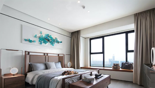 主臥的設計體現出主人對傳統慢生活習慣的追求,床鋪家具的設計上,古樸的色調帶給人寧靜的氛圍,床尾座上的陶瓷茶杯,滿足了主人愛喝茶的習慣。