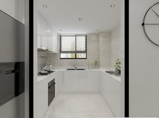 U型設(shè)計(jì)的廚房,以窗戶外的景色為背景,帶給人舒適自然的居住體驗(yàn)。備菜區(qū)、洗菜區(qū)、烹飪區(qū)一氣呵成,動(dòng)線流暢,簡(jiǎn)潔大方。
