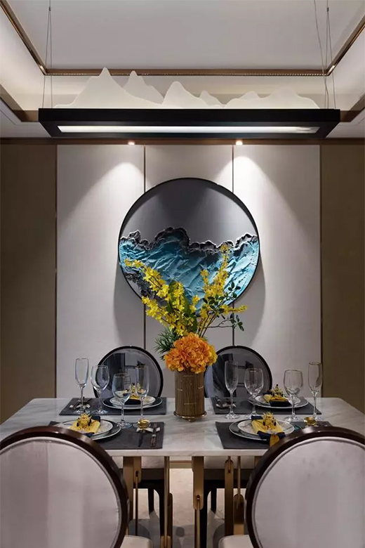 古韻氣息貫穿在整個居家環境中,以棕色、米色、白色為主色調,營造一份淡然的東方韻味;沙發背景墻上飛鳥掠過光影,遠山縹緲隱約,活靈活現。猶如莊公夢蝶,無問真實與虛幻,感受此刻悠然忘我的心境。客廳家具線條簡約流暢,不同材質的運用和碰撞,凸顯新中式風格特有的質感和美感。“山”的元素點綴其中,巧妙地融入屏風、吊燈、桌幾等家具,賦予空間隱約悠遠的意境。