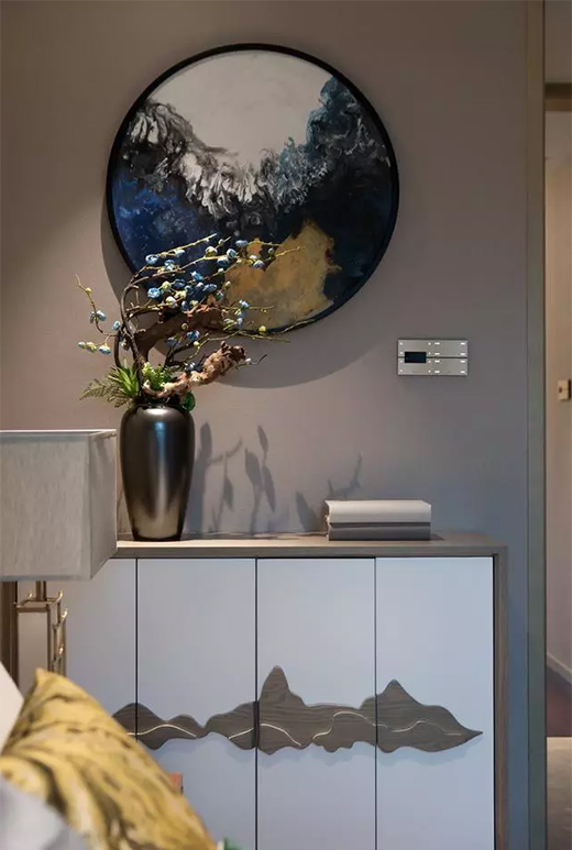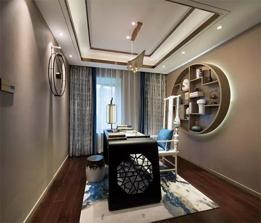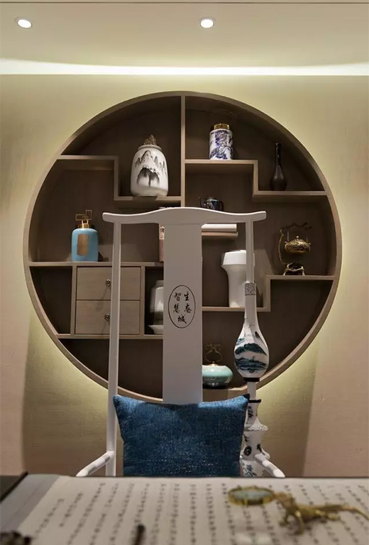 藍黑水墨渲染的地毯,給書房空間增添幾許靜謐的氛圍,于書卷文物中品味禪意和淡然。窗簾運用傳統山水圖案掛簾,呼應主題,作為室內外空間的一個延伸。圓形實木置物區鑲嵌于背景墻面,若即若離,間隙中透出光暈,有日出日落的寓意。文物古董的收藏擺放有序,透露出主人深厚的文化修養。