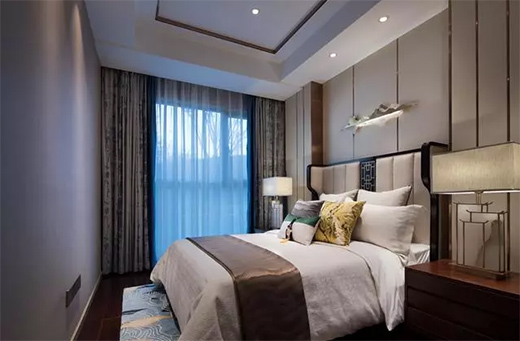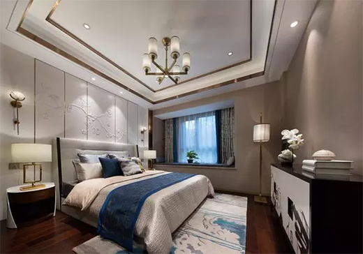 素雅簡潔的美學氣質運用到臥室中,背景墻以白、灰為主色調,海軍藍和水墨加以渲染,自然勾勒出幾分靈動和韻律,給予人無限遐想。