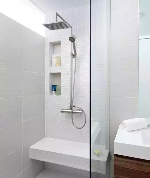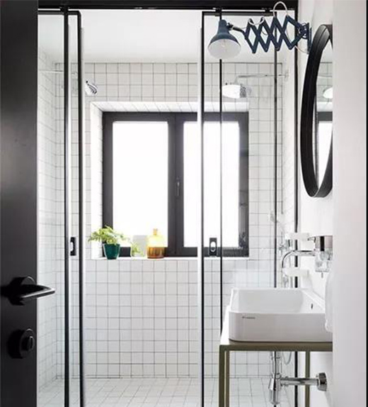 淋浴區(qū)很多人會(huì)設(shè)置擋水條,但是這可能會(huì)增加會(huì)被絆倒的幾率,所以盡量選擇無(wú)下軌的移門,下水速度更快的長(zhǎng)條地漏。