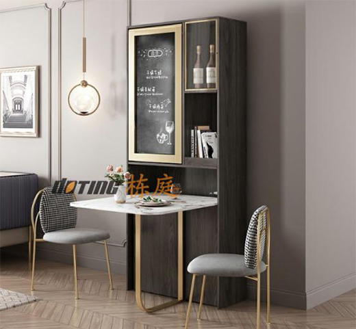 餐桌是餐廳的主角,它的大小直接影響著日常使用的效果。對于小戶型的房子說,因為空間的局限性,可以采用伸縮折疊桌的設(shè)計,再加上折疊椅和可層疊圓凳,不管是人多還是人少都可以使用,通常折疊起來還節(jié)省空間,使用時可根據(jù)需求變身。