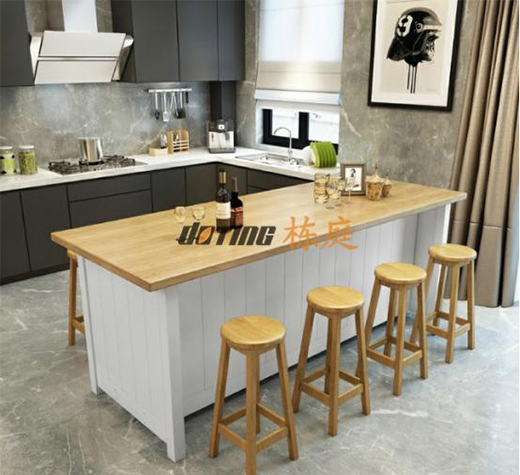 廚房還可以選擇設(shè)計成開放式的,餐廳就可以做成吧臺式,不僅可以定制,還可以購買成品吧臺桌,除了用作桌子、吧臺使用外,還具有隔斷功能,用來分隔廚房和客廳空間,而且吧臺的設(shè)計也顯得更加精致和浪漫。