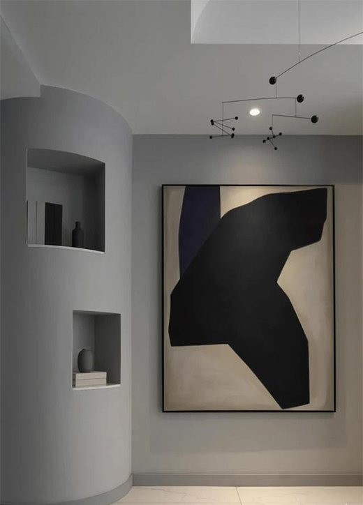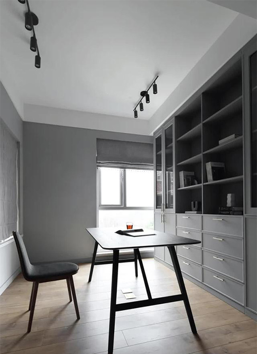 ▲ 書房背景做了一面收納與展示兼備的書柜,灰色調的空間更有利于屋主工作、看書、思考