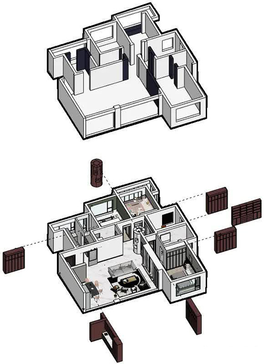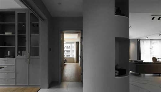 ▲ 圓柱體與臥室衣柜以及客廳背景墻相連,達到了分割作用,進一步提升了主臥私密性