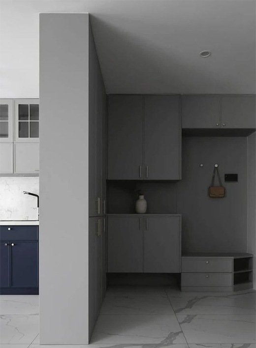 ▲ 玄關做了一組多功能L型柜體,通過鞋柜替代實墻的設計,也完美劃分出獨立玄關和餐廳區域