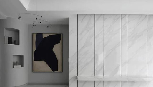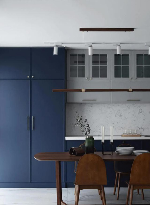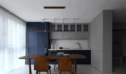 ▲ 冷色調的空間,通過溫潤的木質餐桌椅來中和,灰色玻璃吊柜用于藏酒