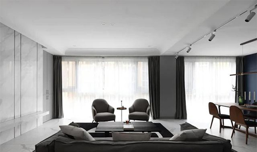 ▲ 客餐廳為橫廳格局,兩面大大的落地窗帶來充足采光,客廳打破傳統沙發正對電視墻的擺放模式,提升居住的合理性和舒適性