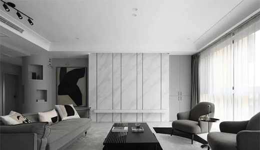 ▲ 布置灰色布藝沙發,搭配不規則色塊的地毯和深色木質茶幾,賦予空間沉穩大氣之感