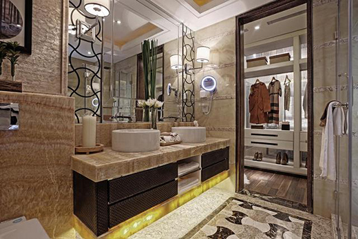 衣帽間和主衛共同構建了主臥的生活區域,中式的樸實無華之下不影響室內華麗的一面,由萬物所構建的新中式空間里,東方的美學情調與現代的審美意趣交織共映,讓人棲居在藝術的深意之中。