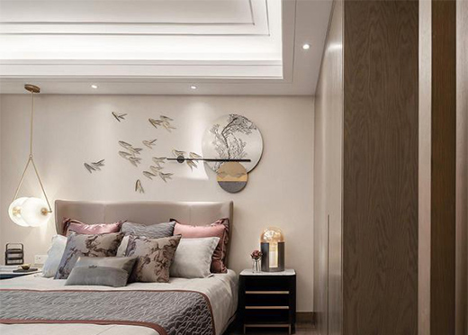 金屬線條的硬朗質感,讓臥室空間更適合現代人的生活,背景裝飾畫以及飛燕元素設計,讓空間展現一動一靜的古典美感。