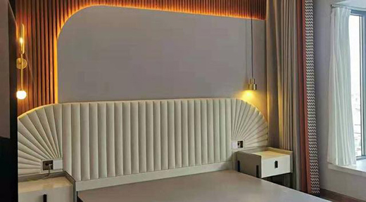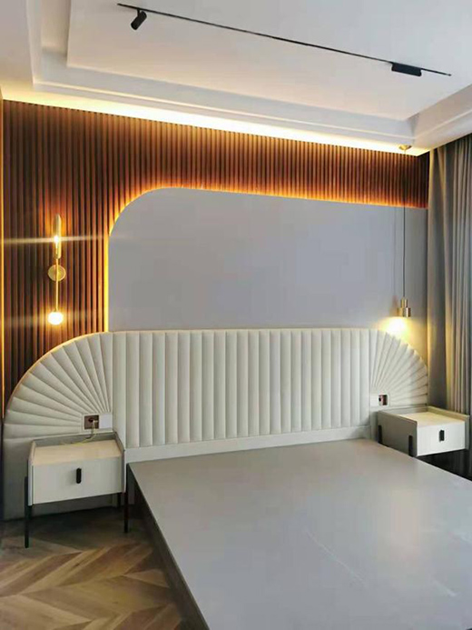 床頭木質條狀護墻效果,既美觀又實用。而個性化的現場定制床頭板,顯得十分精致,有創意感。混搭型的效果呈現一種別致的美感,簡單的床頭柜,沒有雍雅和繁雜,反而呈現了一種現代簡潔的美。