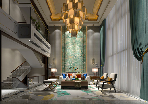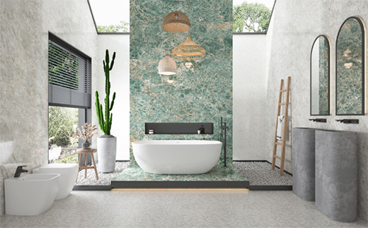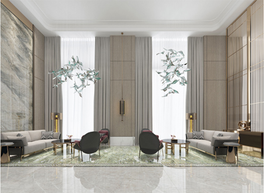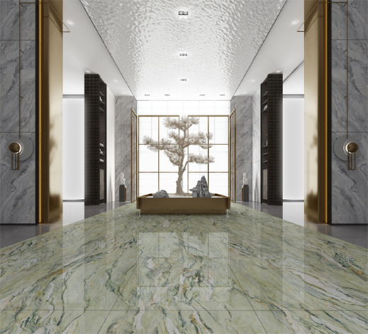 作為搶眼的個性色,綠色也可以大范圍應用,比如在高端商業酒店里,選擇在空間的主視覺范圍鋪滿綠色巖板,讓人如同行走在郁郁蔥蔥的森林中,更寓意酒店的生意勃勃生機、蓬勃發展。