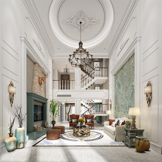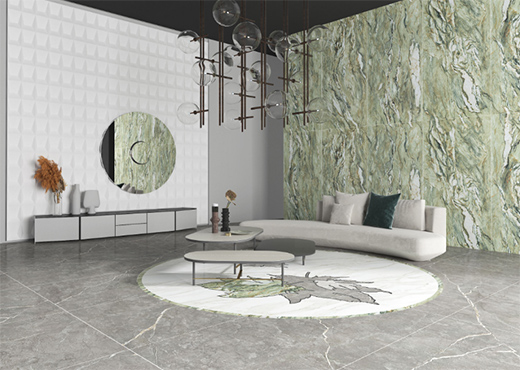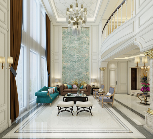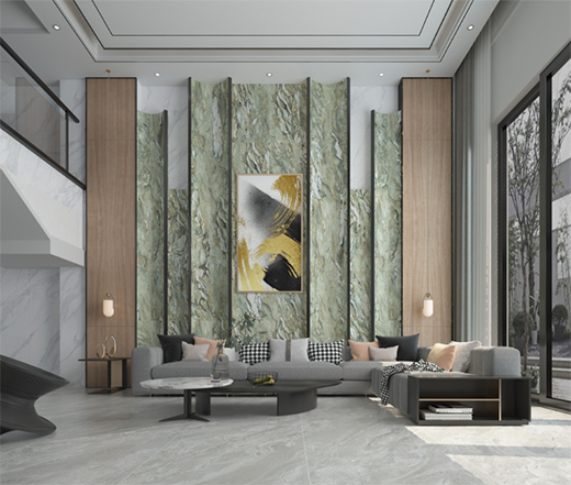 綠色系巖板大面積應用在歐式風格客廳的地面,能代替綠植在空間的作用,讓空間顯得清新自然。綠白色系的搭配,營造出森林深處的靜謐祥和。