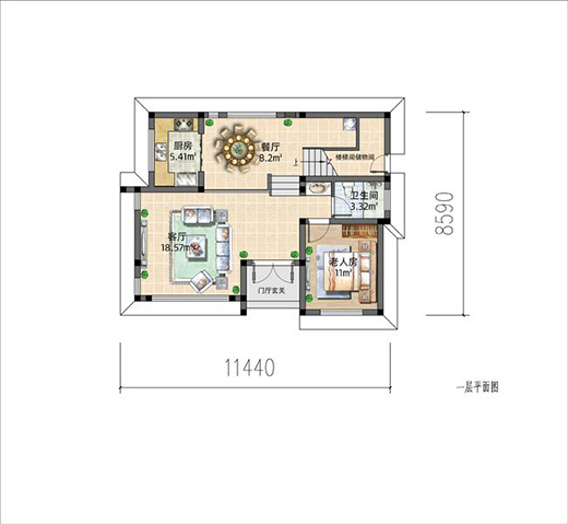 入門即玄關,換好家居服就可以躺在左手邊的沙發上看劇;餐廚一體,用餐方便的同時,避免油污帶到客廳;老人房門前即公衛,起夜更安全;