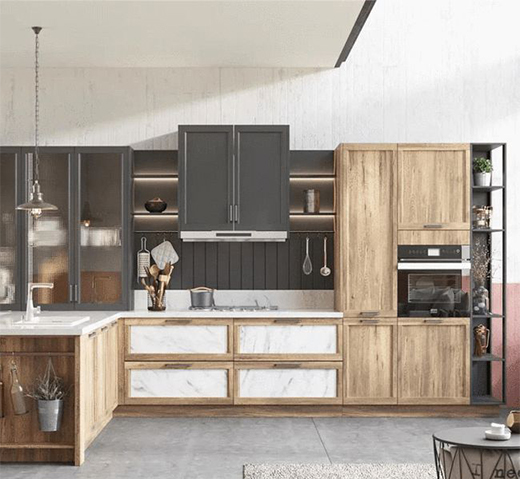 舉個例子:歐派沙利托風格的L型櫥柜,烤箱直接就在櫥柜邊上,不用多占空間。烹飪區與清洗區分開,廚房操作更加便利。