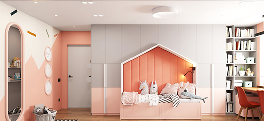 1、女孩的房間:小女孩可以從為她培養性格的角度出發,比如粉色房間,可搭配一些白色、灰色等。搭配淺色小桌,既能收納女孩子的玩具,還可以裝飾房間。