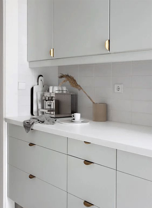 ▲ 進門是廚房操作臺,同時承擔玄關柜的功能,淺灰綠色柜門點綴五金拉手,凸顯小輕奢的細節